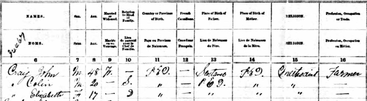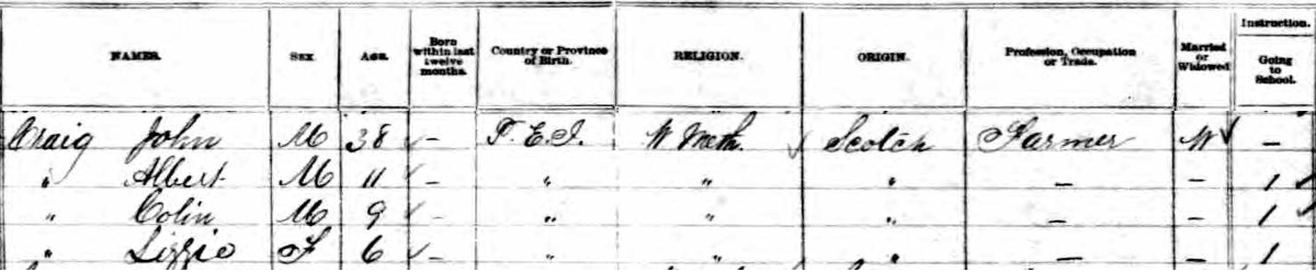 | Witness | He was enumerated on the census in 1881 in the household of John Craig in Lot 27, Prince County, Prince Edward Island, CanadaG. included in the household with John (age 38), now widowed, were his sons Albert (age 11) & Colin (age 9) and daughter Lizzie (age 6). John was a farmer. The household religion was Wesleyan Methodist.3 1881 Canada Census, Lot 27, Prince County, Prince Edward Island. Household of widowed John Craig, his sons Albert & Colin and daughter Elizabeth/Lizzie. |