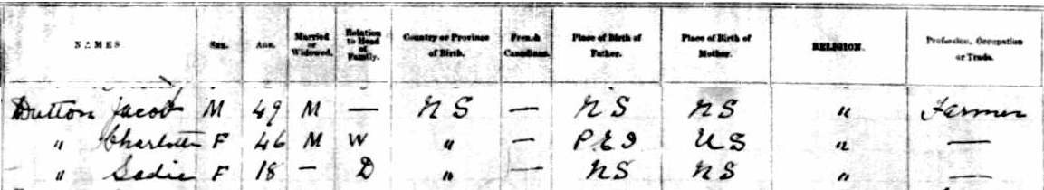 | Witness | She was enumerated on the census on 30 April 1891 in the household of Jacob Romer Dotten in Lansdowne, Manitoba, CanadaG. included in the household with Jacob (age 49) were his wife Charlotte (age 46) and daughter Sadie (age 18). The family religion was Methodist. Their son James lived in the next household as a single man (age 20). Jacob and James were both farmers.2 1891 Canada Census, Lansdowne, Manitoba. Household of Jacob Romer Dotten, his wife Charlotte (Schurman) and daughter Sadie. |