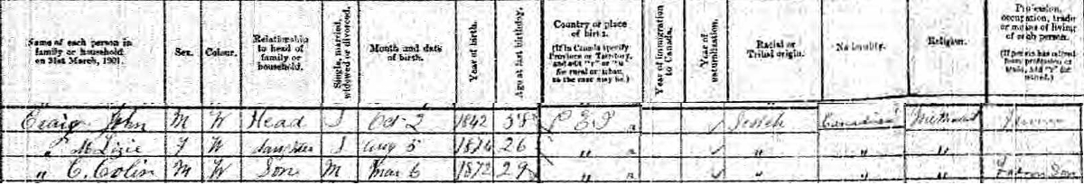 | Witness | Colin Chesley Craig was enumerated on the census on 31 March 1901 in the household of John Craig in Lot 27, Prince County, Prince Edward Island, CanadaG. included in the household with John (age 58) were his son Colin (age 29) and daughter Lizzie (age 26). John and Colin were farmers. The family religion was Methodist.2 1901 Canada Census, Lot 27, Prince County, Prince Edward Island. Household of widowed John Craig, his son Colin and daughter Elizabeth/Lizzie. |