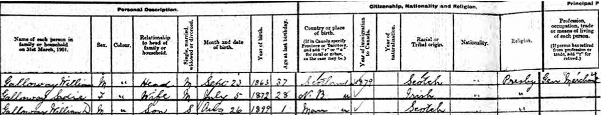| Census | William Galloway was head of the household in the census in 1901 in Gladstone, Manitoba, CanadaG. included in the household with William (age 37) were his wife Sadie Dotten (age 28) and son William (age 1). William's occupation was general merchant. The family religion was Presbyterian.3 1901 Canada Census, Gladstone, Manitoba. Household of William Galloway, his wife Sadie Dotten, their son William. |