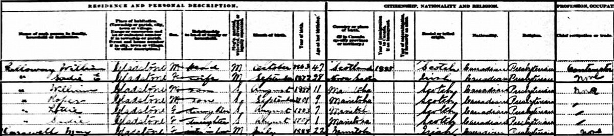 | Witness | She was enumerated on the census in 1911 in the household of William Galloway in Gladstone, Manitoba, CanadaG. included in the household with William (age 47) were his wife Sadie Dotten (age 28 - should be 38), children William (age 11), Roper (age 9), Lottie (age 7) and Sadie (age 1). Also in the household was William sister-in-law, May Carswell (age 22), born in Manitoba. The entry for William's occupation is barely legible as 'construction'. The family religion was Presbyterian. The next household was that of Roper Galloway and his wife. It is assumed that this Roper Galloway is William's brother, based upon the closeness of their ages, they were neighbours, they were both in construction, they both emigrated the same year in 1885, and one of William's sons was named Roper.5 1911 Canada Census, Gladstone, Manitoba. Household of William Galloway, his wife Sadie Dotten, their 4 children, and William's sister-in-law, May Carswell. |