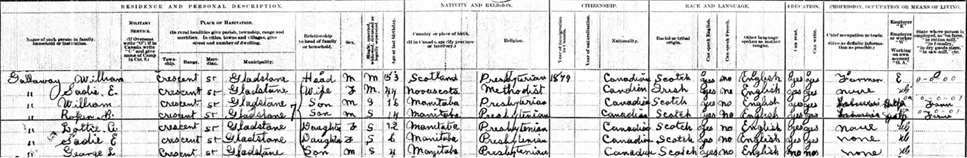 | Census | He was head of the household in the census in 1916 in Crescent St., Gladstone, Manitoba, CanadaG. included in the household with William (age 53) were his wife Sadie Dotten (age 44), children William (age 16), Roper (age 14), Lottie (age 12), Sadie (age 6) and George (age 4). William was a farmer, his sons William & Roper were farm labourers. They lived two houses away from William's brother Roper.5 1916 Canada Census, Gladstone, Manitoba. Household of William Galloway, his wife Sadie Dotten, their children William, Roper, Lottie, Sadie and George. |