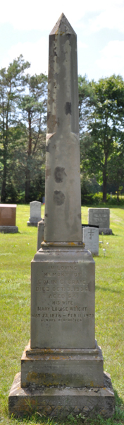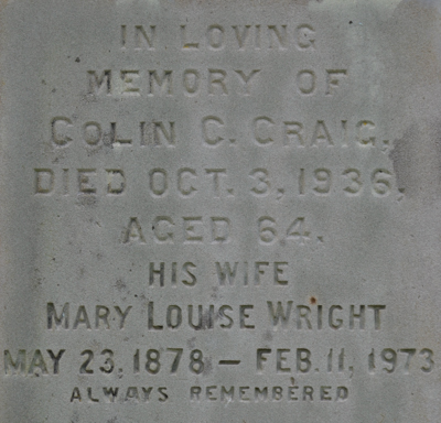| Burial | He was buried in the United Church Cemetery, Searletown, Prince County, Prince Edward Island, Canada, 46.30265, -63.69016G. Inscription: In Loving / Memory of / Colin C. Craig / Died Oct. 3, 1936, / Aged 64. / His Wife / Mary Louise Wright / May 23, 1878 - Feb. 11, 1973 / Always RememberedLeft: In Loving / Memory of / Lizzie May / 1874 - 1917 / Tho' lost to sight / To memory dearRight: John Craig / 1842 - 1925Back: In Memory / of / Jane S. Wright / Beloved Wife of / John Craig / died Sept. 11, 1880. / Æt. 37, / and their daughter / Sarah Jane / died Jany. 2, 1879, / Æt. 3. / Jesus lover of my soul / Let me to thy bosom fly / While the nearer waters roll / While the tempest still is high.7 Tombstone, Colin Chesley Craig (1872-1936), his wife Mary Louise Wright (1878-1973), his sisters Lizzie May Craig (1874-1917) & Sarah Jane Craig (1875-1879), his father John Craig (1842-1925), his mother Jane Schurman Wright (1843-1880). United Church Cemetery, Searletown, Prince County, Prince Edward Island, Canada.  Front inscription detail.  Left inscription detail.  Right inscription detail.  Back inscription detail. |