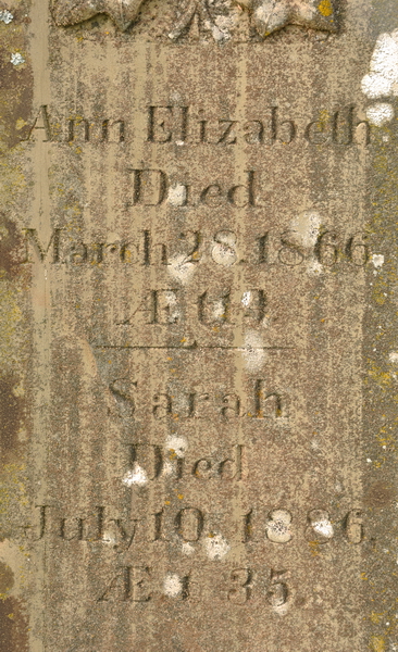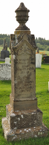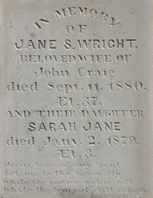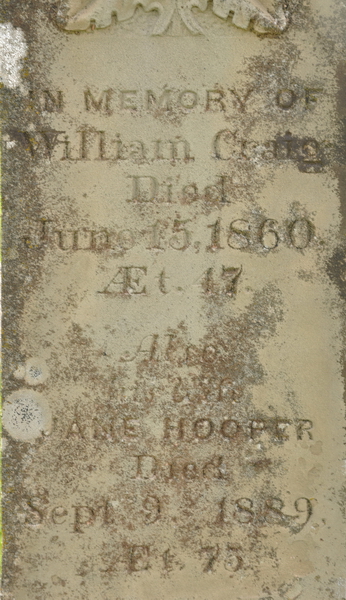 | Burial | She was buried in North Bedeque Cemetery, North Bedeque, Prince County, Prince Edward Island, Canada, 46.36164, -63.72626G. square sandstone obelisk. Inscription: In memory of / William Craig / died / June 15, 1860 / AEt. 47 / Also / his wife / Jane Hooper / died / Sept. 9, 1889 / AEt. 75. Left: Ann Elizabeth / died / March 28, 1866 / AEt. 19 / Sarah / died / July 10, 1886 / AEt. 35. Right: William Artemas / died / April 22 , 1860 / AEt. 4 . There are small adjacent stones, Ann Elizabeth, William Artemas.5,6 Tombstone, William Craig (1813-1860), his wife Jane Hooper (1814-1889), their children Ann Elizabeth (1847-1866), Sarah (1851-1886), William Artemas (c1856-1860). North Bedeque Cemetery, North Bedeque, Prince County, Prince Edward Island.  Front inscription detail.  Left inscription detail.  Right inscription detail. |