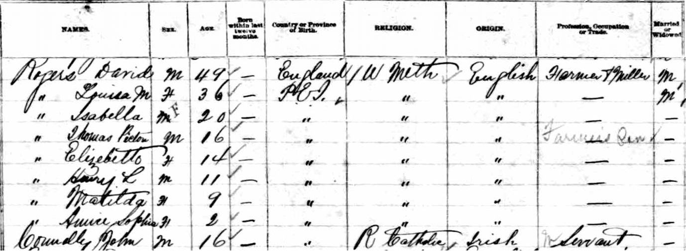 | Witness | He was enumerated on the census in 1881 in the household of David Rogers in Lot 26, Prince County, Prince Edward Island, CanadaG. Enumerated in the household with David (age 49) were his second wife Louisa Wright (age 36), David's children by his first wife, Mary Wright, Isabella (age 20), Thomas Picton (age 16), Elizabeth (age 14) Henry (age 11) & Matilda (age 9), and his daughter Annie Sophia (age 2) by his second wife Louisa. There was also an unrelated Irish Catholic by name of John Connally (age 16), a servant. David was a farmer and miller, his son Thomas was a farmer's son. Thomas, Elizabeth, Henry and Matilda were in school.The family religion was Wesleyan Methodist.2 1881 Canada Census, Lot 26, Prince County, Prince Edward Island. Household of David Rogers, his second wife Louisa Wright, his children by his first marriage to Mary Wright, Isabella, Thomas Picton, Elizabeth, Henry & Matilda, and his daughter Annie Sophia by his second wife, Louisa. |