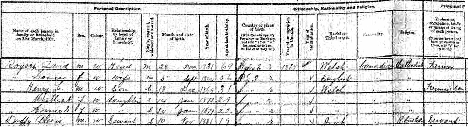 | Witness | Henry Llewellyn Rogers was enumerated on the census on 16 April 1901 in the household of David Rogers in Lot 26, Prince County, Prince Edward Island, CanadaG. Enumerated in the household with David (age 69) were his second wife Louisa Wright (age 56), David's children by his first wife, Mary Wright, henry (age 31) & Matilda (age 29), and his daughter Annie Sophia (age 22) by his second wife Louisa. There was also an unrelated Irish Catholic by name of Alexis Duffy (age 19), a servant. David was a farmer, his son Henry a farmer's son. Thomas, Elizabeth, Henry and Matilda were in school.The family religion was Methodist.3 1901 Canada Census, Lot 26, Prince County, Prince Edward Island. Household of David Rogers, his second wife Louisa Wright, his children by his first marriage to Mary Wright, Henry & Matilda, and his daughter Annie Sophia by his second wife, Louisa. |