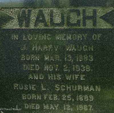Inscription: WAUGH / In Loving Memory of / John Waugh / Born July 1836 / Died Nov. 1917. / His Wife / Eliza A. Boulter / Born April 1852 / Died March 1930Back: WAUGH / In Loving Memory of / J. Harry Waugh / Born Mar. 13, 1883 / Died Nov. 2, 1938 / And His Wife / Rusie L. Schurman / Born Feb 25, 1889 / Died May 12, 1967.3  Cemetery marker, John Waugh (1836-1917), his wife Eliza Boulter (1852-1930), their son Harry Waugh (1883-1938), his wife Rusie Schurman (1889-1967). United Baptist Cemetery, Central Bedeque, Prince County, Prince Edward Island, Canada.  Back inscription detail.