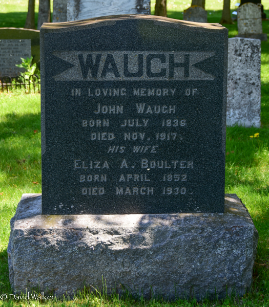 - [S12350] Cemetery marker, United-Baptist Cemetery, Central Bedeque, Prince County, Prince Edward Island, Canada. John Waugh & Eliza Boulter, tombstone inscription & photograph; read by David A. Walker.