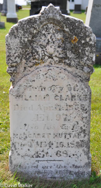 Inscription: In / Memory of / William Clarke / Died Apr. 11, 1855 / Æt. 97 / Also his wife / Margaret Muttart / Died May 16, 1828 / Æt. 68. / Blessed are the dead / who die in the Lord.1  Tombstone, William Clarke (1758-1855), his wife Margaret Muttart (1760-1828). United Church Cemetery, Cape Traverse, Prince County, Prince Edward Island, Canada.