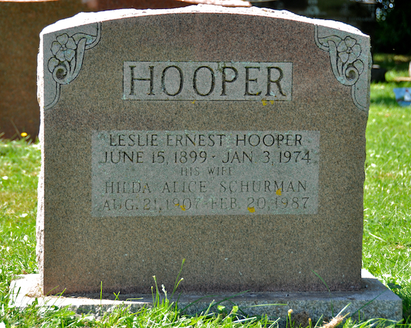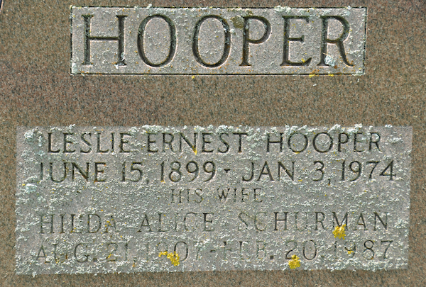 - [S6171] Cemetery Marker - Leslie Ernest Hooper. Leslie Ernest Hooper & Hilda Alice Schurman, tombstone inscription; David A. Walker.