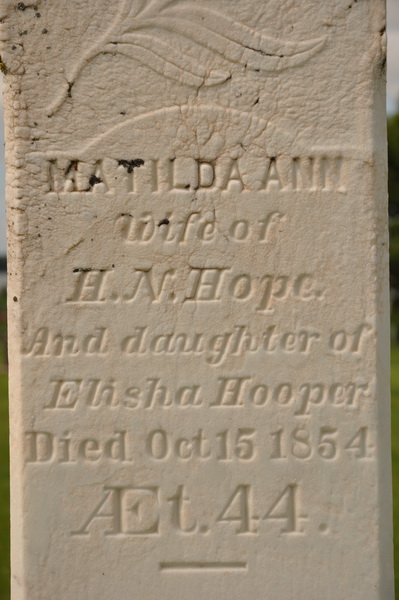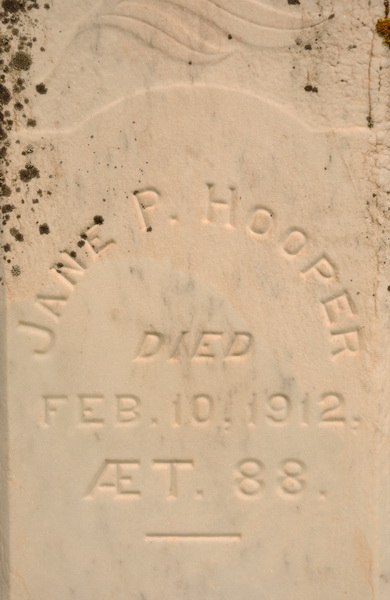 | Burial | She was buried in Bedeque Cemetery, Lower Bedeque, Prince County, Prince Edward Island, Canada, 46.34687, -63.73385G. Inscription: Sacred to the memory of / Thomas Hooper / United Empire / Loyalist / settled in Bedeque / 1785 / Also his son / Elisha / died Mar. 18, 1860 / Aet. 78 / and his wife / Margaret Crosby / died May 31, 1843 / Aet. 62 / erected by Jane P. Hooper. Left side: Matilda Ann / wife of H.N. Hope / and daughter of Elisha Hooper / died Oct. 15, 1854 / Aet. 44. Right side: William / son of Elisha Hooper / drowned Aug. 12, 1874 / Aet. 59. Rear: Jane P. Hooper / died / Feb 10, 1912 / Aet. 88.3 Front inscription detail.  Tombstone, Thomas Hooper Sr. (1734-1816), his son Elisha (1782-1860), his wife Margaret Crosby (1780-1843), Matilda Ann Hooper (1810-1854), William Hooper (1815-1874) and Jane Payne Hooper (1822-1912), children of Elisha Hooper. Bedeque Cemetery (aka United Church Cemetery, Lower Bedeque), Prince County, Prince Edward Island.  Left inscription detail.  Right inscription detail.  Back inscription detail. |