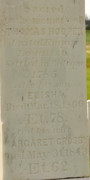| Burial | He was buried in the United Church Cemetery, Lower Bedeque, Prince County, Prince Edward Island, Canada, 46.34687, -63.73385G. Inscription: Sacred to the memory of / Thomas Hooper / United Empire / Loyalist / settled in Bedeque / 1785 / Also his son / Elisha / died Mar. 18, 1860 / Aet. 78 / and his wife / Margaret Crosby / died May 31, 1843 / Aet. 62 / erected by Jane P. Hooper. Left side: Matilda Ann / wife of H.N. Hope / and daughter of Elisha Hooper / died Oct. 15, 1854 / Aet. 44. Right side: William / son of Elisha Hooper / drowned Aug. 12, 1874 / Aet. 59. Rear: Jane P. Hooper / died / Feb 10, 1912 / Aet. 88.4 Front inscription detail.  Tombstone, Thomas Hooper Sr. (1734-1816), his son Elisha (1782-1860), his wife Margaret Crosby (1780-1843), Matilda Ann Hooper (1810-1854), William Hooper (1815-1874) and Jane Payne Hooper (1822-1912), children of Elisha Hooper. Bedeque Cemetery (aka United Church Cemetery, Lower Bedeque), Prince County, Prince Edward Island.  Left inscription detail.  Right inscription detail.  Back inscription detail. |