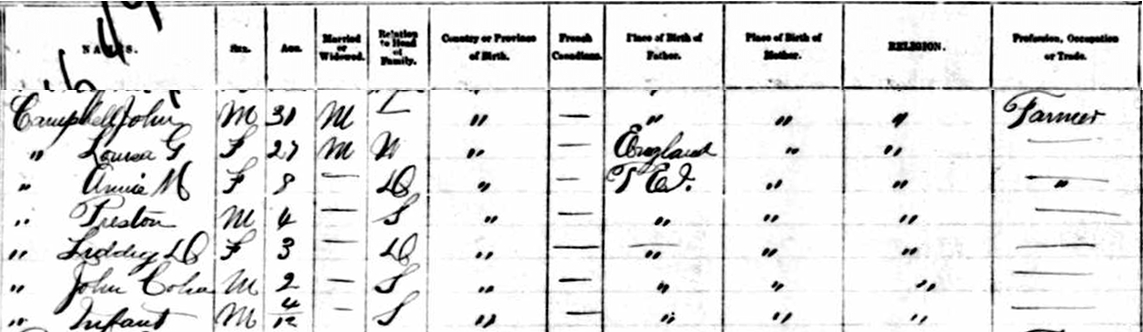 | Witness | She was enumerated on the census on 11 April 1891 in the household of John Campbell in Lot 20, Queens County, Prince Edward Island, CanadaG. included in the household with John (age 31) were his wife Louisa Grace Tuplin (age 27), their children Annie (age 8), Preston (age 4), Lydia (age 3), John Colin (age 2) and James Edwin (age 4 months). John was a farmer. The family religion was Presbyterian.2 1891 Canada Census, Lot 20, Queens County, Prince Edward Island. Household of John Campbell, his wife Louisa Grace Tuplin, their children Annie, Preston, Lydia, John Colin and James Edwin. |