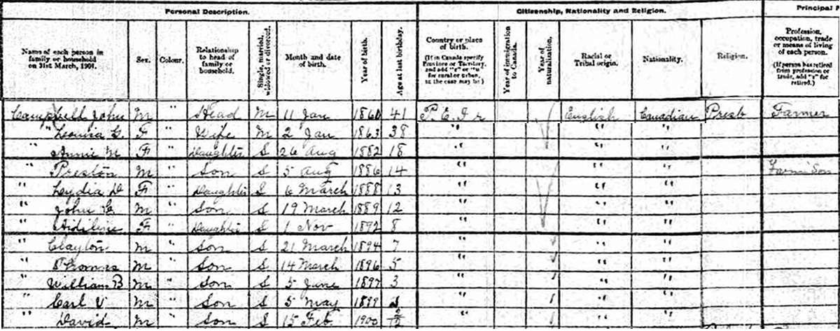 | Witness | She was enumerated on the census in April 1901 in the household of John Campbell in Long River, Queens County, Prince Edward Island, CanadaG. included in the household with John (age 41) were his wife Louisa Grace Tuplin (age 38), their children Annie (age 18), Preston (age 14), Lydia (age 13), John Colin (age 12), Adaline (age 8), Clayton (age 7), Thomas (age 5), William (age 3), Carl (age 1) and David (age 2 months). John was a farmer, Preston a farmer's son. The family religion was Presbyterian.3 1901 Canada Census, Long River, Lot 20, Queens County, Prince Edward Island. Household of John Campbell, his wife Louisa Grace Tuplin, their children Annie, Preston, Lydia, John, Adaline, Clayton, Thomas, William, Carl and David. |