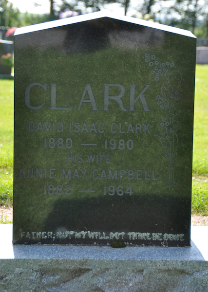 | Burial | He was buried in the Peoples Cemetery, Kensington, Prince County, Prince Edward Island, Canada, 46.44840, -63.62897G. Inscription: CLARK / David Isaac Clark / 1880-1980 / His Wife / Annie May Campbell / 1882 - 1964 / Father, Not My Will But Thine Be Done. Back: Susan Priscilla / Sister of / David I. Clark / 1886-1979.1 Tombstone, David Isaac Clark (1805-1980), his wife Annie May Campbell (1882-1964), his sister Susan Priscilla (1886-1979). The Peoples Cemetery, Kensington, Prince County, Prince Edward Island, Canada.  Front inscription detail.  Back inscription detail. |