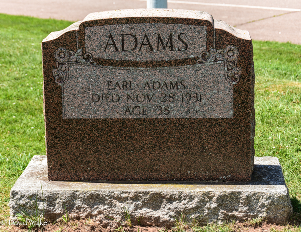 Inscription: ADAMS / Earl Adams / Died Nov. 28, 1931 / Age 38.2,3  Tombstone, Earl Adams (1893-1931). St. Stephen's Anglican Church Cemetery, Irishtown, Queens County, Prince Edward Island, Canada.