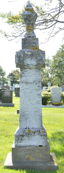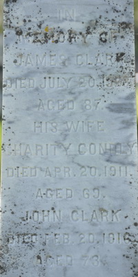 | Burial | He was buried in the Peoples Cemetery, Malpeque, Prince County, Prince Edward Island, Canada, 46.52990, -63.68667G. Inscription: In / Memory of / James Clark / Died July 20, 1928 / Aged 87 / His Wife / Charity Condly / Died Apr. 20, 1911 / Aged 69 / John Clark / Died Feb 20, 1916 / Aged 73Left: In / Memory of / Mary E. E. Clark / Wife of / William A. Boles / Born Sept. 24, 1870 / Died July 7, 1897Right: In / Memory of / Francis James / Born Apr. 15, 1877 / Died June 9, 1878 / Annie Ada / Born Sept. 6, 1878 / Died May 12, 1900 / Children of / James & Charity Clark.1 Tombstone, James Clark (1838-1928), his wife Charity Condley (1842-1911), John Clark (1841-1916), brother of James, Mary E. E. Clark (1870-1897), Francis James (1877-18780, Annie Ada (1878-1900), children of James & Charity Clark. Peoples Cemetery, Malpeque, Prince County, Prince Edward Island, Canada.  Front inscription detail.  Left inscription detail.  Right inscription detail. |