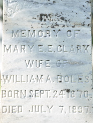 | Burial | She was buried in the Peoples Cemetery, Malpeque, Prince County, Prince Edward Island, Canada, 46.52990, -63.68667G. Inscription: In / Memory of / James Clark / Died July 20, 1928 / Aged 87 / His Wife / Charity Condly / Died Apr. 20, 1911 / Aged 69 / John Clark / Died Feb 20, 1916 / Aged 73Left: In / Memory of / Mary E. E. Clark / Wife of / William A. Boles / Born Sept. 24, 1870 / Died July 7, 1897Right: In / Memory of / Francis James / Born Apr. 15, 1877 / Died June 9, 1878 / Annie Ada / Born Sept. 6, 1878 / Died May 12, 1900 / Children of / James & Charity Clark.1 Tombstone, James Clark (1838-1928), his wife Charity Condley (1842-1911), John Clark (1841-1916), brother of James, Mary E. E. Clark (1870-1897), Francis James (1877-18780, Annie Ada (1878-1900), children of James & Charity Clark. Peoples Cemetery, Malpeque, Prince County, Prince Edward Island, Canada.  Front inscription detail.  Left inscription detail.  Right inscription detail. |