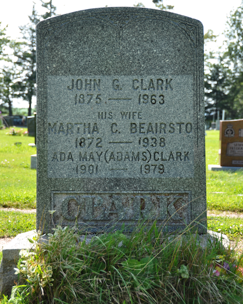 | Burial | She was buried in the Peoples Cemetery, Kensington, Prince County, Prince Edward Island, Canada, 46.448500, -63.629000G. Inscription: John G. Clark / 1875-1963 / His Wife / Martha C. Beairsto / 1872-1938 / Ada May (Adams) Clark / 1901-1979 / CLARK.1 Tombstone, John Geddie Clark (1875-1963), his wife Martha C. Beairsto (1872-1938), his second wife Ada May Paynter (1901-1979). The Peoples Cemetery, Kensington, Prince County, Prince Edward Island, Canada. |