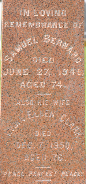 | Burial | She was buried in Geddie Memorial Cemetery, Springbrook, Queens County, Prince Edward Island, Canada, 46.49420, -63.50755G. Inscription: In Loving / Memory of / Sarah E. Bernard / Wife of / William Bernard / Died / Jan. 7, 1914. / Aged 84. / - / William Bernard / Died / Oct. 29, 1923, / Aged 90 / BERNARDLeft: In Loving / Remembrance of / Samuel Bernard / Died / June 27, 1946, / Aged 74. / - / Also His Wife / Lydia Ellen Clark / Died / Dec. 7, 1950, / Aged 76. / Peace Perfect PeaceRight: At Rest / David Daisley / Died / Oct. 26, 1923, / Aged 62.1 Tombstone, William Bernard (1833-1923), his wife Sarah Elizabeth Bernard (1830-1914), their son Samuel Bernard (1871-1946), his wife Lydia Ellen Clark (1874-1950), and David Daisley (1861-1923). Geddie Memorial Cemetery, Springbrook, Queens County, Prince Edward Island, Canada.  Front inscription.  Left inscription.  Right inscription. |