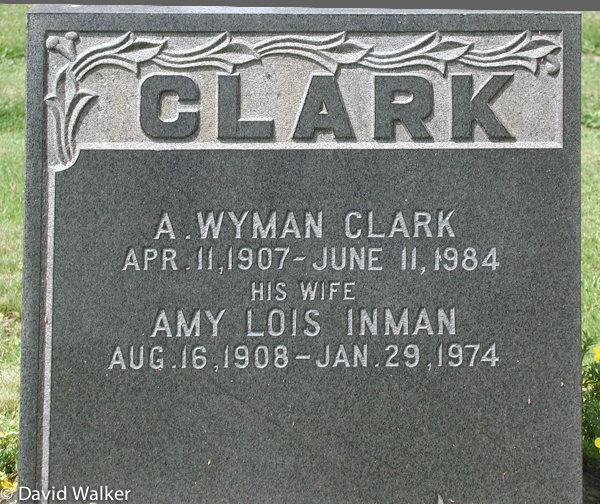 | Burial | He was buried on 10 April 1940 in the Peoples Cemetery, Summerside, Prince County, Prince Edward Island, CanadaG. Section O1, Row 6, Stone #1194Inscription: CLARK / Ewen Clark / 1856 - 1940. / Rosara MacGregor / Wife of / Ewen Clark / 1864 - 1923.Back: A. Wyman Clark / Apr. 11, 1907 - June 11, 1984 / His Wife / Amy Lois Inman / Aug. 1908 - Jan 29, 1974.7,8,2 Back inscription.  Tombstone, Ewen Clark (1856-1940) & Rosara MacGregor (1864-1923), their son Wyman Clark (1907-1984), his wife Lois Inman (1908-1974). |