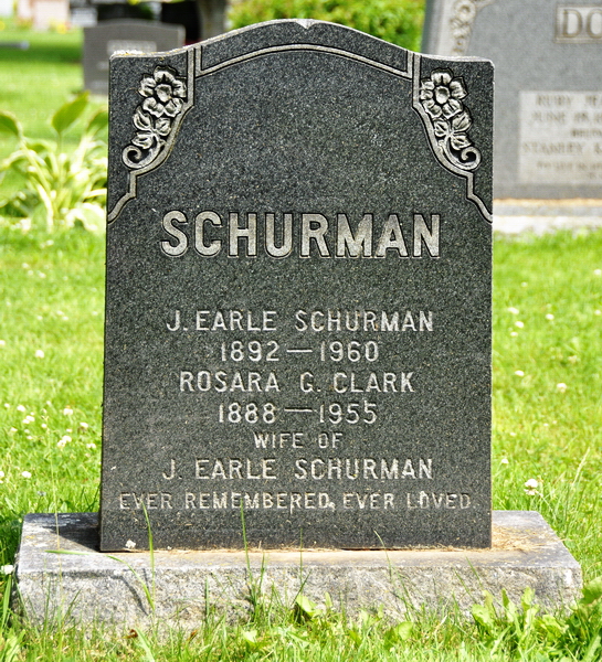 | Burial | He was buried in the Peoples Cemetery, Summerside, Prince County, Prince Edward Island, Canada, 46.40485, -63.77584G. Inscription: SCHURMAN / J. Earle Schurman / 1892 - 1960 / Rosara G. Clark / 1888 - 1955 / Wife of / J. Earle Schurman / Ever remembered, ever loved.2 Tombstone, Jacob Earle Schurman & Rosara Gretha Clark. Peoples Cemetery, Summerside, Prince County, Prince Edward Island, Canada. |