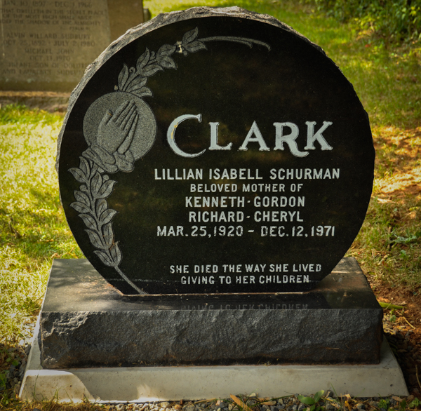 Inscription: CLARK / Lillian Isabell Schurman / Beloved mother of / Kenneth - Gordon / Richard - Cheryl / Mar. 25, 1920 - Dec. 12, 1971. / She died the way she lived / giving to her children.1  Tombstone, Lillian Isabell Schurman (1920-1971). United/Baptist Cemetery, Central Bedeque, Prince County, Prince Edward Island, Canada.
