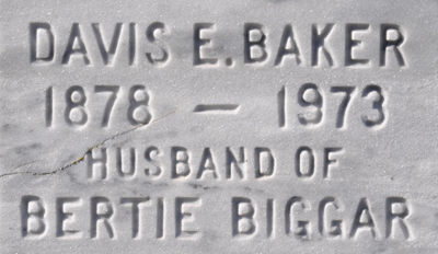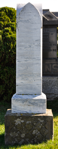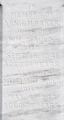 Inscription: In / Memory of / Joseph Baker / Jan. 16, 1929 / Aged 78 Years / Catherine Gillis / Wife of / Joseph Baker / Died / May 23, 1920 / Aged 69 YearsLeft: Elizabeth Baker / Wife of / Joseph Perry / Died / Feb. 19, 1958 / Aged 84 YearsRight: In / Memory of / Annie M. Baker / Wife of / Wm. F. Auld / Died / Sept. 15, 1941 / Aged 58 Years / Also of / William Auld / Died / May 4, 1943 / Aged 75 Years / At ResBack: Davis E. Baker / 1878 - 1973 / Husband of / Bertie Biggar.1  Tombstone, Joseph Baker (1851-1929), his wife Catherine Gillis (1850-1920), their daughter Elizabeth (1874-1958), their daughter Annie (1883-1941), her husband William Auld (1865-1943), Davis E. Baker, son of Joseph & Catherine, (1878-1973). Peoples Cemetery, Lower Freetown, Prince County, Prince Edward Island, Canada.  Front inscription detail.  Left inscription detail.  Right inscription detail.  Back inscription detail.