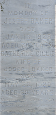 - [S9930] Tombstone, Peoples Cemetery, Freetown, Prince County, Prince Edward Island, Canada. Joseph Baker & Catherine Gillis family plot, tombstone inscription; read by David A. Walker, 13 September 2014.