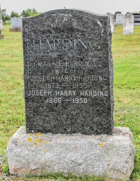 Inscription: HARDING / Mary E. Harding / Wife of Joseph Harry Harding / 1873 - 1935 / Joseph Harry Harding / 1866 - 1950.1,2  Cemetery Marker: Joseph Harry Harding (1866-1950), his wife Mary E, Harding (1873-1935). St. Thomas Anglican Church Cemetery, Springbrook, Queens County, Prince Edward Island, Canada.