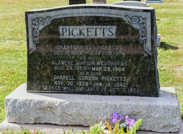 Inscription: PICKETTS / Crawford Roy Picketts / Dec. 15, 1902 - Sept. 10, 1974 / His Wife / Blanche Marion Weatherby / Mar. 24, 1908 - Mar. 28, 1984 / Their Sons / Darrell Gordon Picketts / Nov. 30, 1939 - Jan. 18, 1946 / George William July 22 - Oct. 15, 1936.2  Cemetery Marker: Crawford Roy Picketts (1902-1974), his wife Blanche Marion Weatherby (1908-1984), their sons Darrell Gordon (1939-1946) and George William (1936-1936). Peoples Cemetery, Kensington, Prince County, Prince Edward Island, Canada.