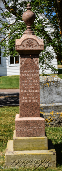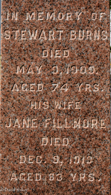 Inscription: In Memory of / Stewart Burns / Died / May 9, 1909, / Aged 74 Yrs. / His Wife / Jane Fillmore / Died / Dec. 9, 1919 / Aged 83m Yrs.1  Tombstone, Stewart Burns (c1835-1909), his wife Jane Fillmore (1836-1919). United-Baptist Cemetery, Central Bedeque, Prince County, Prince Edward Island, Canada.  Front inscription detail.