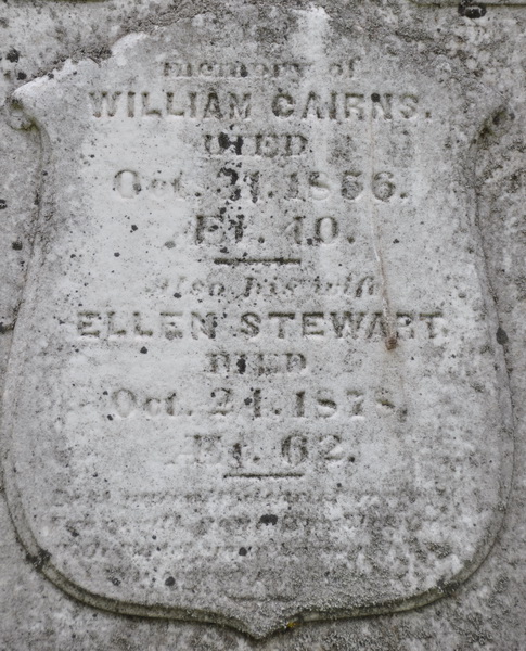 | Burial | She was buried in United Church Baptist Cemetery, Central Bedeque, Prince County, Prince Edward Island, Canada, 46.34222, -63.70280G. Inscription: In / Memory of / William Cairns / Died / Oct. 31, 1856 / AEt. 40 / Also His Wife / Ellen Stewart / Died / Oct. 24, 1878 / AEt. 62 / script[CR:].2 Tombstone, William Cairns (1816-1856), his wife Ellen Stewart (1816-1878). United Baptist Cemetery, Central Bedeque, Prince County, Prince Edward Island, Canada.  Inscription detail. |