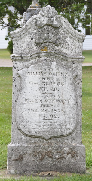 | Burial | He was buried in United Baptist Church Cemetery, Central Bedeque, Prince County, Prince Edward Island, Canada, 46.34222, -63.70280G. Inscription: In / Memory of / William Cairns / Died / Oct. 31, 1856 / AEt. 40 / Also His Wife / Ellen Stewart / Died / Oct. 24, 1878 / AEt. 62 / script[CR:].2 Tombstone, William Cairns (1816-1856), his wife Ellen Stewart (1816-1878). United Baptist Cemetery, Central Bedeque, Prince County, Prince Edward Island, Canada.  Inscription detail. |