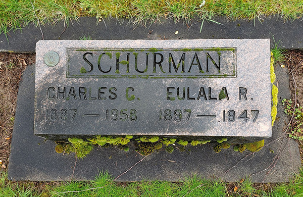 Inscription: SCHURMAN / Charles C. / 1887 - 1958 | Eulala R. / 1897 - 1947.8  Marker, Charles Cook Schurman (1887-1958), his wife Eulala Ruth Conley (1897-1947). Crescent Grove Cemetery, Tigard, Washington County, Oregon, U.S.A. Photo courtesy of findagrave.com.