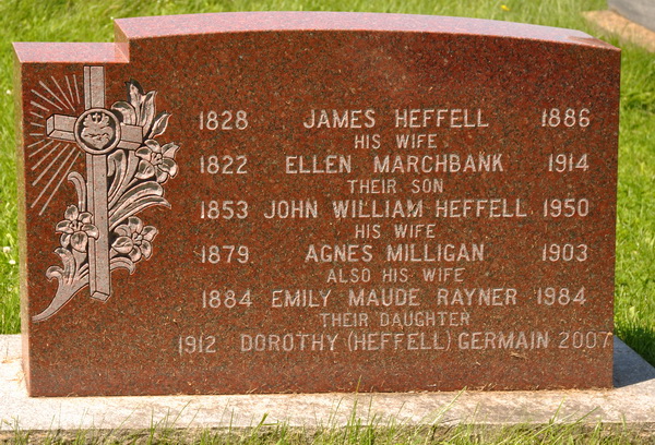 Red granite tombstone. Inscription: 1828 James Heffell 1886 / His Wife / 1822 Ellen Marchbank 1914 / Their Son / 1853 John William Heffell 1950 / His Wife / 1879 Agnes Milligan 1903 / Also His Wife / 1884 Emily Maude Rayner 1984 / Their Daughter / 1912 Dorothy (Heffell) Germain 2007.2  Tombstone, James Heffell (1828-1886) and family membersNorth Bedeque Cemetery, Prince County, Prince Edward Island, Canada.