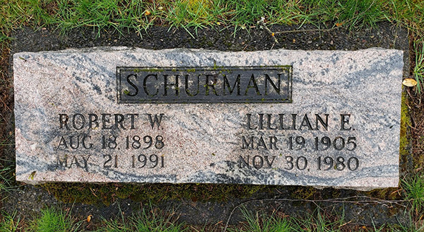 Inscription Front: SCHURMAN / Robert W. / Aug. 18, 1898 / May 21, 1991 | Lillian E. / Mar. 19, 1905 / Nov. 30, 1980.3  Marker, Robert Wesley Schurman (1898-1991), his wife Lillian Eliza Howell (1905-1980). Crescent Grove Cemetery, Tigard, Washington County, Oregon, U.S.A. Photo courtesy of findagrave.com.