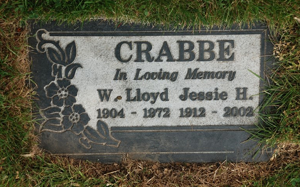 Inscription Front: CRABBE / In Loving Memory / W. Lloyd / 1904 - 1972 | Jessie H. / 1912 - 2002.1  Marker, William Lloyd Crabbe (1904-1972), his wife Jessie Helen MacKay (1912-2002). Civic Cemetery, Courtenay, British Columbia, Canada. Photo courtesy of findagrave.com.