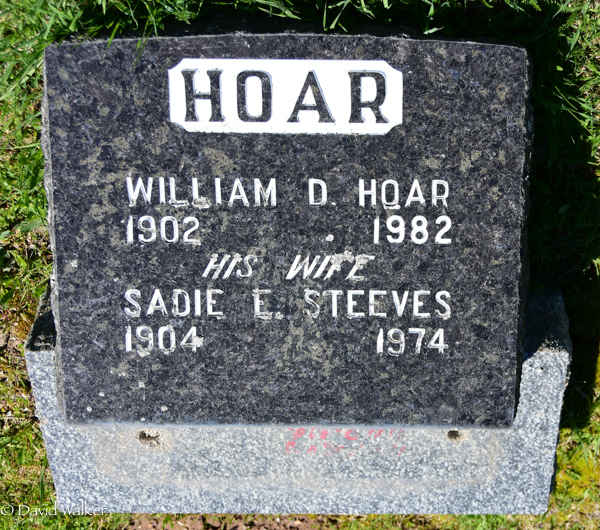 Section C, C0747Inscription: HOAR / William D. Hoar / 1902 - 1982 / His Wife / Sadie E. Steeves / 1904 - 1974.2,3  Tombstone, William D. Hoar (1902-1982), his wife Sadie E. Steeves (1904-1974). Elmwood Cemetery, Moncton, Westmorland County, New Brunswick, Canada. Photo courtesy of Jane Wood (findagrave.com).