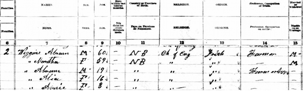 | Census | He was head of the household in the census in 1881 in Waterborough, Queens County, New Brunswick, CanadaG. included in the household were Abram's wife Martha, children Abram (age 19), Alice (age 16) and Annie (age 3). He was a farmer, his son was a farmer's son. Alice was "going to school". The family religion was Church of England.3 1881 Canada Census, Waterborough, Queens County, New Brunswick. Household of Abraham R. Wiggins, his wife Martha Ann Wiggins, and their children Abraham, Alice and Annie. |