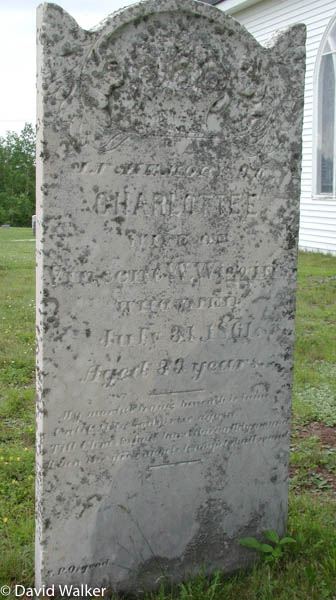 Inscription: In memory of / Charlotte / Wife of / Vincent Wiggins / Who Died / July 31, 1861. / Aged 39 years.1  Tombstone, Charlotte Wiggins (1822-1861). St. Luke's Anglican Church Cemetery, Youngs Cove Road, Queens County, New Brunswick, Canada.