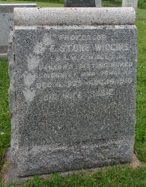 | Burial | He was buried in St. Luke's Anglican Church Cemetery, Youngs Cove, Queens County, New Brunswick, CanadaG. Inscription: Professor / E. Stone Wiggins / B.A. M.A. M.D. L.LD. / Canada's Distinguished / Scientist and Scholar / Dec. 4, 1839 - Aug. 14, 1910 / His Wife Susie.5 Tombstone for Ezekiel Stone Wiggins (1839-1910) and his wife Susan (1846-1921), St. Luke's Anglican Church Cemetery, Youngs Cove, Queens County, New Brunswick, Canada. |