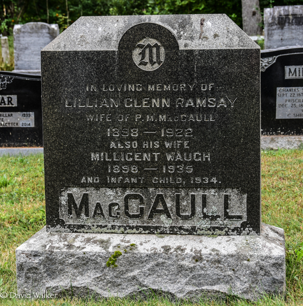 | Principal 2 | She witnessed the burial of Peter Millar MacCaull and Lillian Glenn Ramsay in the Presbyterian Cemetery, Tyne Valley, Prince County, Prince Edward Island, Canada, 46.57316, -63.93051G.3,4 Tombstone, Peter Millar MacCaull (1897-1993), his first wife Lillian Glenn Ramsay (1898-1922), his second wife Millicent Waugh (1898-1935), their infant child (1934-1934), his third wife Rena Beryl Neill (1911-1999). Presbyterian Church Cemetery, Tyne Valley, Prince County, Prince Edward Island, Canada.  Back inscription detail. |