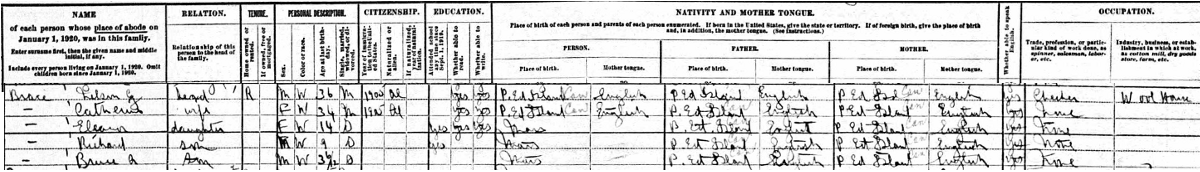 - [S8144] 1901 Canada Census, Charlottetown Royalty, Queens County, Prince Edward Island, Household #198, Richard K. Brace, 1901, Microfilm, LAC Roll T-6428 to T-6556, page 19. District Queens West, District Number 136, Subdistrict Charlottetown Royalty, Number A-10. National Archives of Canada, National Archives of Canada, 395 Wellington St., Ottawa, Ontario, Canada.