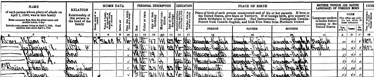 | Census | He was head of the household in the census on 3 April 1930 in Boston, Suffolk County, Massachusetts, USAG. included in the household with Nelson (age 47), his wife Catherine McLellan (age 46), their children Richard (age 19), Bruce (age 13), Eleanor (age 24) and Eleanor's husband Charles O'Brien (age 24). Nelson was a foreman for an express company, Charles was a chaufeur for an express company.9 1930 US Census, Boston, Suffolk County, Massachusetts. Household of Nelson T. Brace, his wife Catherine McLellan, their children Richard, Bruce, Eleanor and Eleanor's husband Charles O'Brien. |