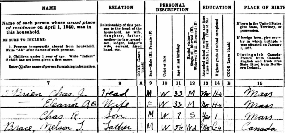 | Witness | He was enumerated on the census on 4 April 1940 in the household of Charles J. O'Brien in 186 Hamilton St., Boston, Suffolk County, Massachusetts, USAG. included in the household of Charles (age 33), his wife Eleanor Brace (age 33), their son Charles (age 7), Eleanor's widowed father Nelson Brace (age 56). Charles was a laundry agent, Nelson a labourer for a wool transportation company.10 1940 US Census, Boston, Suffolk County, Massachusetts. Household of Charles J. O'Brien, his wife Eleanor Brace, their son Charles, Eleanor's widowed father Nelson Brace. |