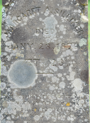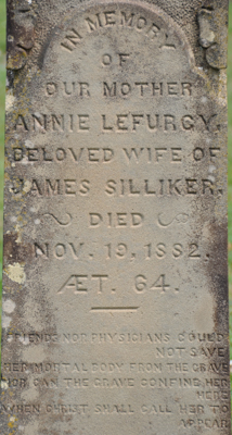 Inscription: In Memory / of / Our Mother / Annie Lefurgey / Beloved Wife of / James Silliker / Died / Nov. 19, 1882 / ÆT. 64 / Friends nor physicians could / not save / her mortal body from the grave / nor can the grave confine her / here / when Christ shall call her to / appearLeft: Margaret A. Silliker / Died / Jany. 28, 1879 / ÆT. 23Right: James Silliker / Born / Aug. 15, 1820 / Died / Jan. 20, 1907.1,3  Tombstone, Annie Lefurgey (1818-1882), her husband James Silliker (1820-1907), their daughter Margaret (1853-1879). United Baptist Cemetery, Central Bedeque, Prince County, Prince Edward Island, Canada.  Front inscription detail.  Left inscription detail.  Right inscription detail.