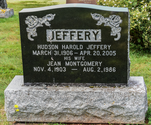 Inscription: JEFFERY / Hudson Harold Jeffery / March 31, 1906 - Apr. 20, 2005 / His Wife / Jean Montgomery / Nov. 4, 1903 - Aug. 2, 1986.2,3  Tombstone, Hudson Harold Jeffery (1906-2005), his wife Jean Montgomery (1903-1986). United-Baptist Cemetery, Central Bedeque, Prince County, Prince Edward Island, Canada.