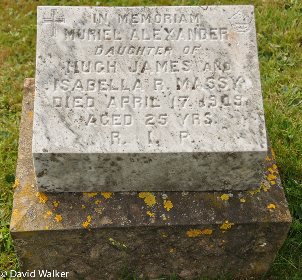 Inscription: In Memoriam / Muriel Alexander / Daughter of / Hugh James and / Isabella R. Massy / Died April 17, 1909 / Aged 25 yrs. / R. I. P.2  Tombstone, Muriel Alexander Massy (1884-1909). St. John's Anglican Church Cemetery, St. Eleanors, Prince County, Prince Edward Island, Canada.