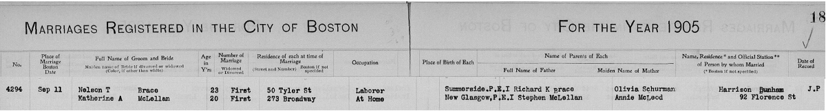 | Marriage | He married Catherine McLellan daughter of Stephen McLellan and Annie McLeod, on 11 September 1905, in Boston, Suffolk County, Massachusetts, USAG.6 Marriage Registration, Nelson T. Brace & Catherine McLellan. |